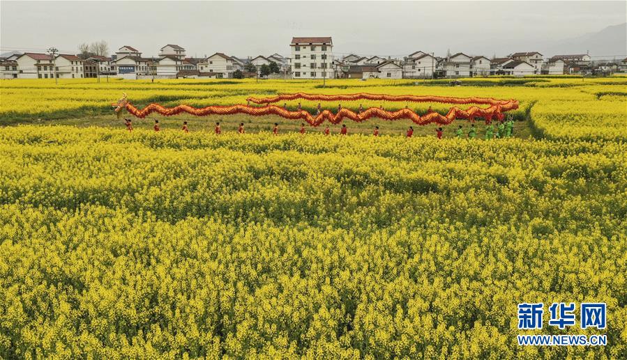 3月22日,在汉中市汉台区,一支舞龙队在油菜花海表演(无人机拍摄)。近日,陕西省汉中盆地的油菜花盛开,美不胜收。 新华社记者 陶明 摄