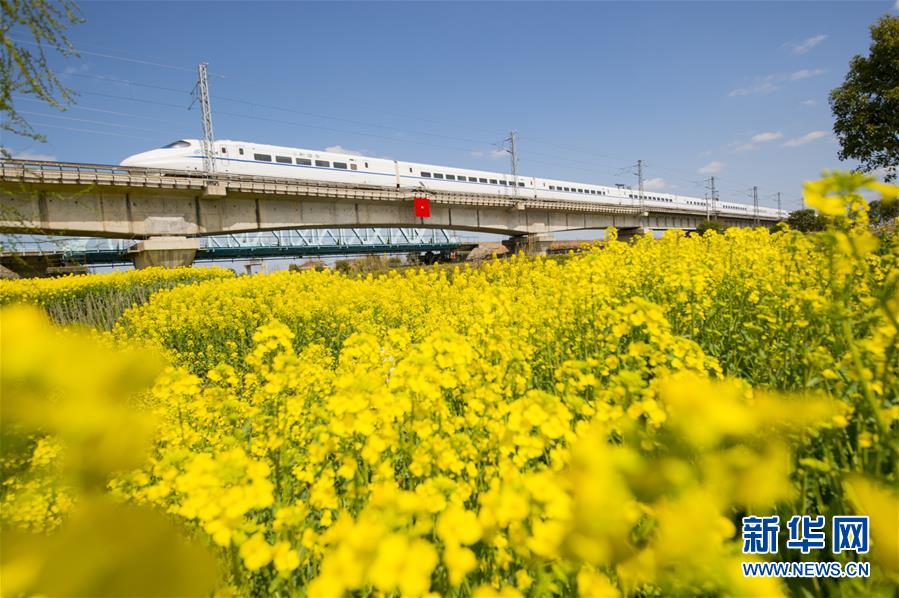 3月22日,列车从油菜花田旁驶过。 随着气温升高,江苏南通海安市的油菜花陆续开放。 新华社发(徐劲柏 摄)