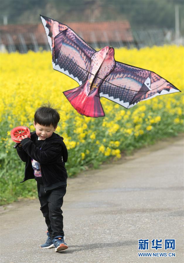 3月23日,小朋友在东白湖镇油菜花田间放风筝。 随着气温回升,浙江省诸暨市东白湖镇油菜花盛开,吸引大批游客前来观赏。东白湖镇自2010年起开始建设油菜花景观工程,目前全镇油菜的种植面积近万亩,花期每年接待游客30余万人次,成为当地乡村旅游的一张金名片。 新华社记者翁忻旸摄