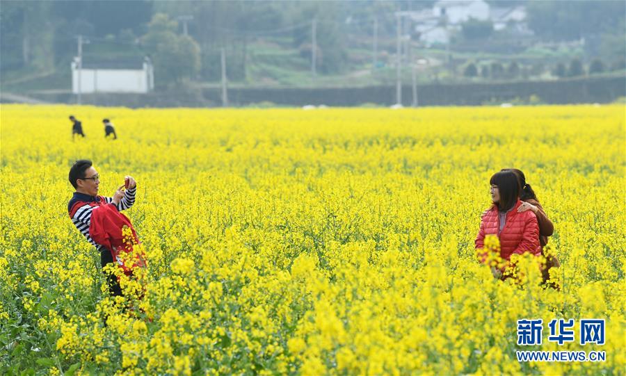3月23日,游客在东白湖镇油菜花田间留影。 随着气温回升,浙江省诸暨市东白湖镇油菜花盛开,吸引大批游客前来观赏。东白湖镇自2010年起开始建设油菜花景观工程,目前全镇油菜的种植面积近万亩,花期每年接待游客30余万人次,成为当地乡村旅游的一张金名片。 新华社记者翁忻旸摄