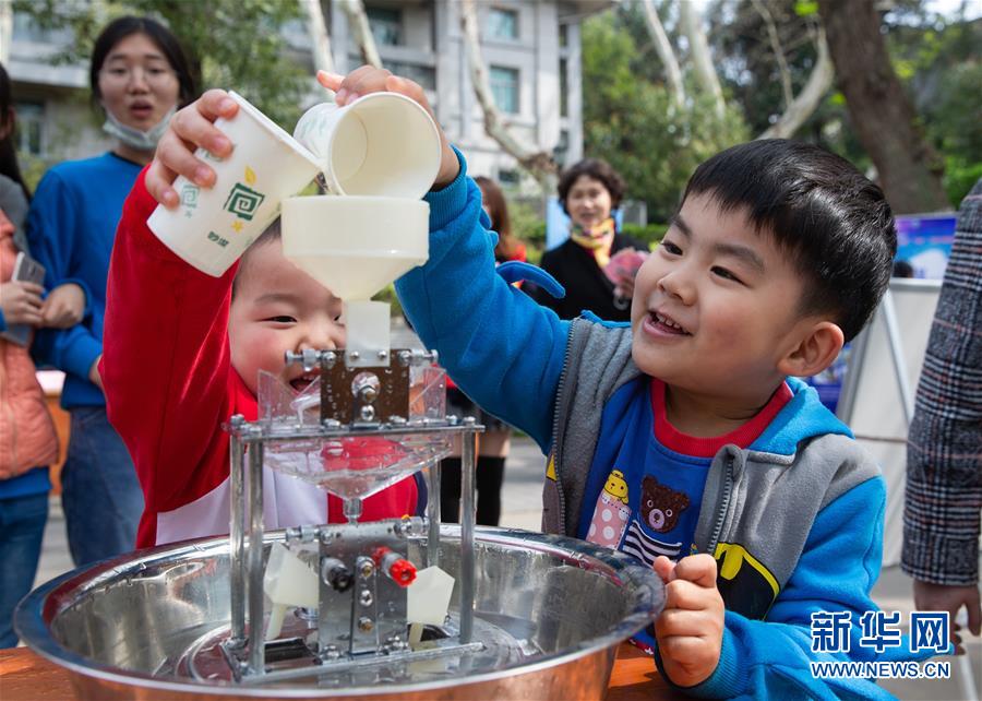 3月23日,在位于南京的中国北极阁气象博物馆,小朋友在体验翻斗式雨量传感器。