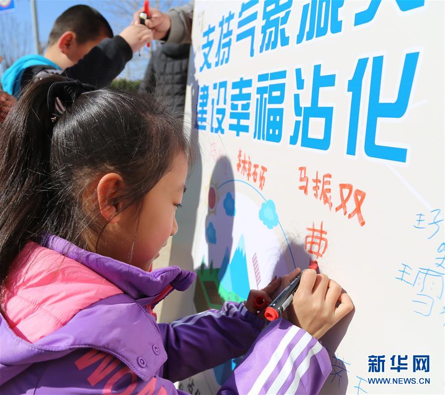 3月23日,在山东省滨州市沾化区气象局,孩子们在气象减灾志愿服务活动展板上签名。