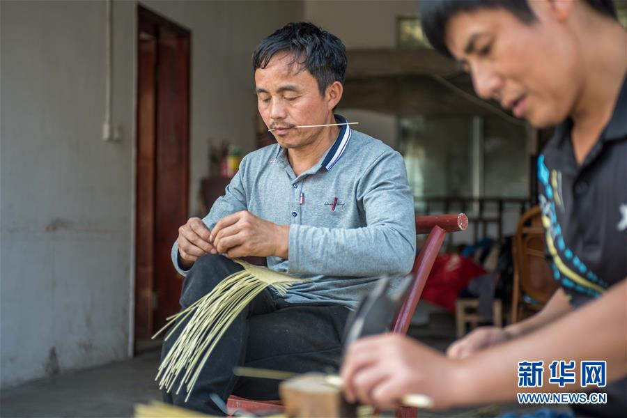 胡廷贤(左)与徒弟胡兵在自家门前编织土家族传统竹编(3月20日摄)。 新华社记者 万志云 摄