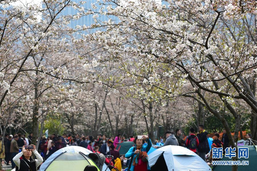 3月23日,人们在无锡太湖新城金匮公园赏樱游玩。 新华社发(还月亮 摄)
