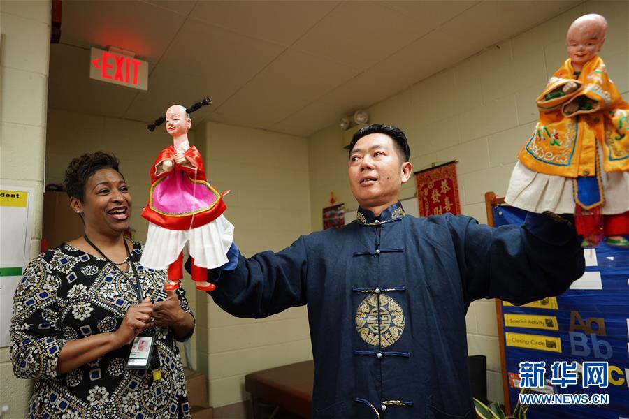 3月20日,在美国马里兰州乔治王子县的潘布兰奇小学,福建漳州布袋木偶戏传承人陈黎晖(右)演示木偶戏。