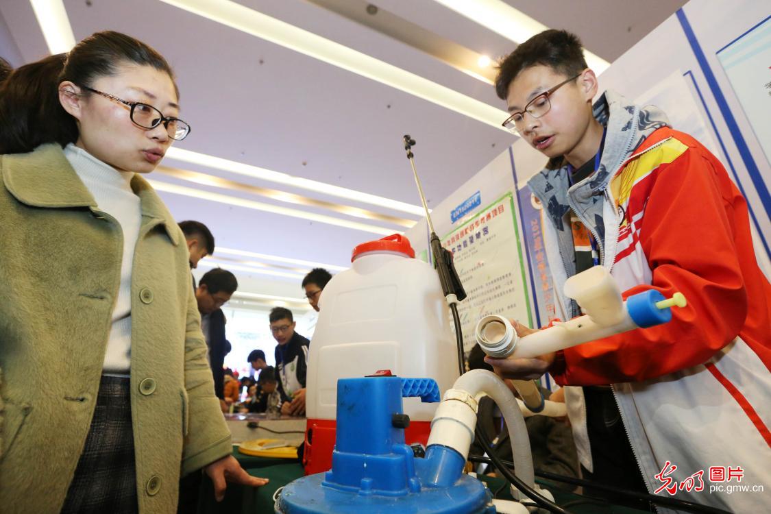 3月23日,安徽省2019年青少年科技创新大赛在淮北市矿业集团会议中心拉开序幕。来自全省18支代表队、600多位青少年和144名科技辅导员,携带各类参赛作品853项参加竞赛、展示和交流活动。图为学生们在演示自己的科技发明和创新。(李鑫摄/光明图片)