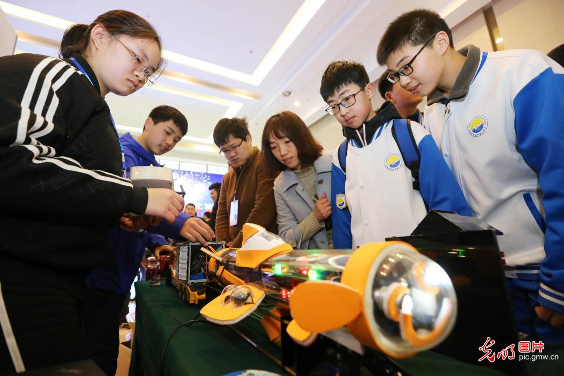 3月23日,安徽省2019年青少年科技创新大赛在淮北市矿业集团会议中心拉开序幕。来自全省18支代表队、600多位青少年和144名科技辅导员,携带各类参赛作品853项参加竞赛、展示和交流活动。图为学生在演示自己的科技发明——仿生水质巡检机。(李鑫摄/光明图片)