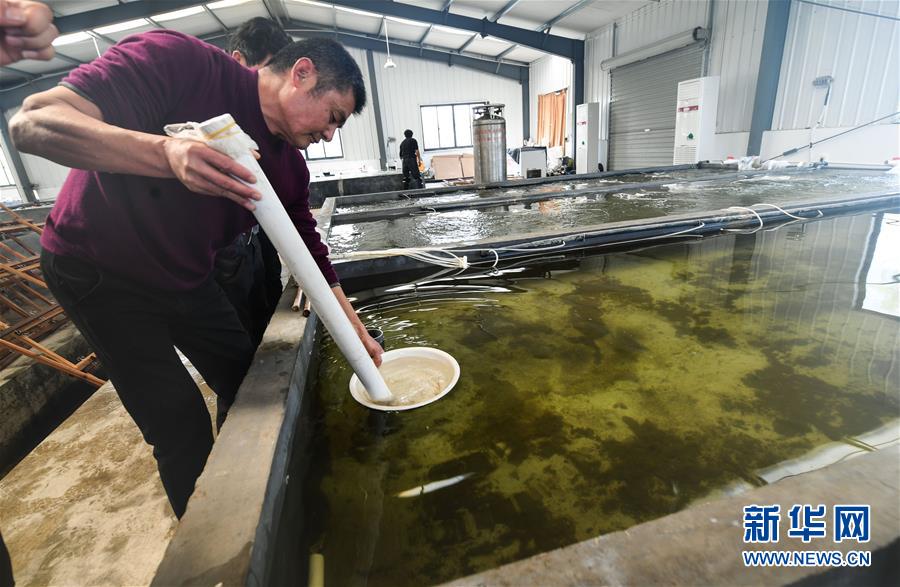 3月24日,东林镇保健村湖旺水产育苗基地的负责人费志平在育苗车间查看鱼苗长势情况。进入3月下旬,浙江省湖州市吴兴区东林镇迎来了淡水鱼鱼苗销售的旺季。2014年东林镇对污染较大的温室龟鳖养殖开始整治工作,原来的龟鳖养殖户开始从事淡水鱼水产养殖业,目前东林镇淡水鱼的养殖面积已达3万亩。其中保健村的湖旺水产育苗基地是浙北地区最大的特种水产苗种繁殖基地,现有600多亩鱼塘,室内育苗车间500立方米,年产各类鱼苗10亿尾,鱼苗日销售量达5000万尾。 新华社记者徐昱摄