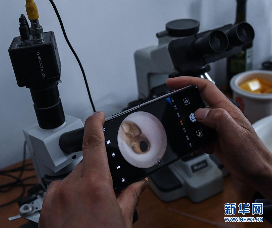 3月24日,东林镇保健村湖旺水产育苗基地的技术人员用手机通过显微镜拍摄鱼苗照片以备分析存档。进入3月下旬,浙江省湖州市吴兴区东林镇迎来了淡水鱼鱼苗销售的旺季。2014年东林镇对污染较大的温室龟鳖养殖开始整治工作,原来的龟鳖养殖户开始从事淡水鱼水产养殖业,目前东林镇淡水鱼的养殖面积已达3万亩。其中保健村的湖旺水产育苗基地是浙北地区最大的特种水产苗种繁殖基地,现有600多亩鱼塘,室内育苗车间500立方米,年产各类鱼苗10亿尾,鱼苗日销售量达5000万尾。 新华社记者徐昱摄