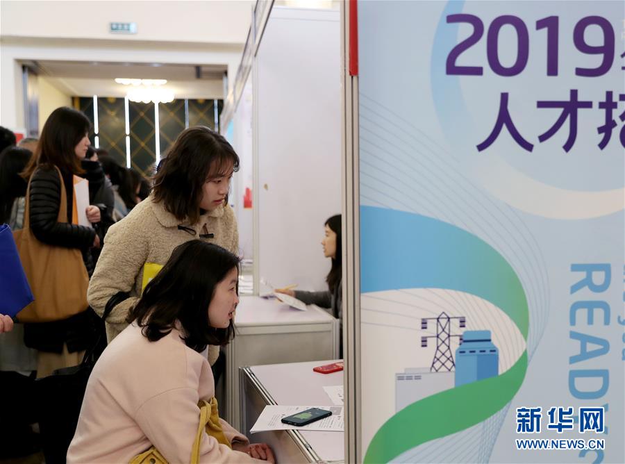 3月24日,求职者在招聘会上与招聘单位交流。当日,由上海、江苏、浙江、安徽联合举办的“长三角地区春季人才交流洽谈会暨2019届高校毕业生择业招聘会”在上海展览中心举行。 新华社记者 刘颖 摄