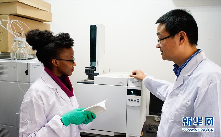 筛选优质农作物、编写植物志、防沙治沙、反盗猎……2019年3月24日,记者从中国科学院获悉,该院中-非联合研究中心针对非洲的一些特点和难点,近年来开展具有科技含量的基础性合作研究,推动了中非共同绿色发展,促进中非友谊向深度发展。这张2017年3月21日拍摄的资料照片显示,中-非联合研究中心水资源与生态环境监测领域科研人员王俊研究员(右)在中科院武汉植物园指导2014级肯尼亚留学生蒙加伊使用实验仪器。 新华社发(康克兢摄)