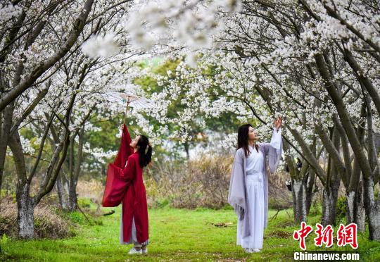 3月23日,在江西省南昌县凤凰沟景区,连日来的阴雨天气也阻挡不住樱花进入盛放期,满树繁花,织就一派云蒸霞蔚的浪漫景色,樱花树下游人如织,不少人驻足树下留影,不少身着汉服的美女也来拍照。鲍赣生 摄