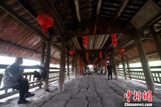 图为贡川地标之一的会清桥。会清桥地板高低起伏着丹崖石板,56根支柱,斗拱别致。 张斌 摄
