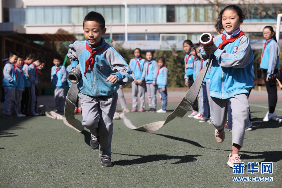 3月25日,在河北省石家庄市振头小学“平安校园 安全你我”主题活动中,学生在体验消防设备。 当日是全国中小学生安全教育日,各地开展形式多样的活动,普及各类安全知识,增强学生们的安全意识。 新华社发(梁子栋 摄)
