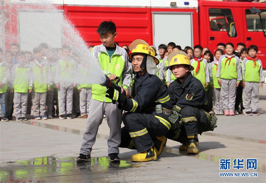 3月25日,河北省邯郸市肥乡区第二实验小学的学生在消防演练中学习使用水枪。 当日是全国中小学生安全教育日,各地开展形式多样的活动,普及各类安全知识,增强学生们的安全意识。 新华社发(胡高雷 摄)