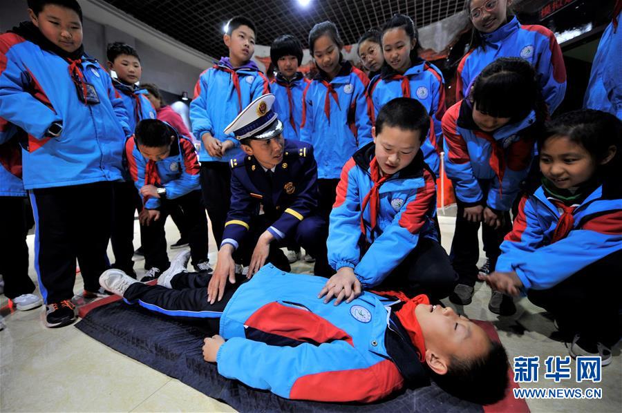 3月25日,河北省承德市双滦区第四小学学生在消防体验馆学习急救知识。 当日是全国中小学生安全教育日,各地开展形式多样的活动,普及各类安全知识,增强学生们的安全意识。 新华社发(王立群 摄)