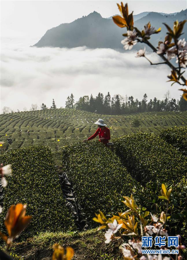 3月25日,湖北省恩施市屯堡乡花枝山村茶农在恩施玉露茶园内采摘春茶。 新华社发(文林 摄)