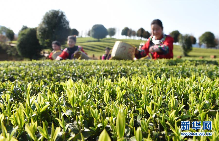 3月25日,茶农在贵州省铜仁市松桃苗族自治县普觉镇大同茶场采摘明前茶。 新华社发(龙元彬 摄)