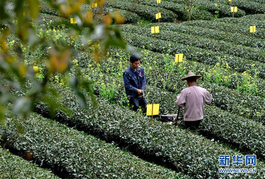 3月26日,在武夷山市星村镇的生态茶园,茶农们把种在茶树间的油菜花打成肥料施肥。 春分过后,柳绿花红。福建武夷山的十多万亩茶山青翠欲滴,一派生机勃勃的景象。再过一个月,将迎来繁忙的春茶采摘加工期。 新华社记者魏培全摄