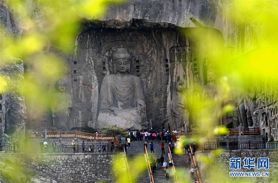绿树掩映下的河南省洛阳市龙门石窟景区(3月26日摄)。 仲春时节,河南省洛阳市龙门石窟景区春意盎然,石刻造像掩映在绿树之间,构成别样风景,吸引不少游客前来。 新华社记者李安摄