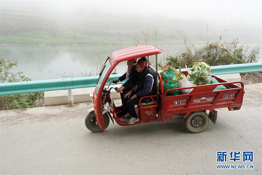 3月25日,苗族妇女杨树立(右)和张两翁驾驶三轮车给学校送菜。 新华社记者 陈晔华 摄