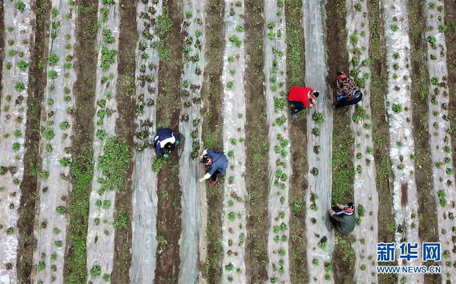 3月24日,苗族妇女们在地里劳作(无人机拍摄)。 新华社记者 杨文斌 摄