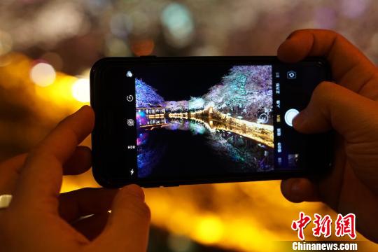 前来观赏夜樱的游客拿出手机拍摄夜景。 孙权 摄