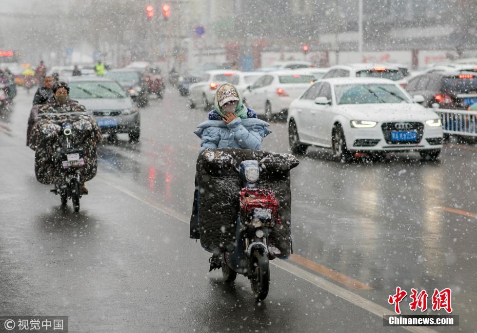 2019年3月28日,受冷空气影响,呼和浩特市出现大风降温、雨夹雪、小雨天气。在呼和浩特市玉泉区石羊桥路,行人冒雪出行。 图片来源:视觉中国