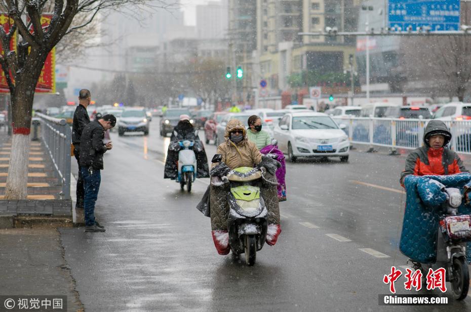 2019年3月28日,受冷空气影响,呼和浩特市出现大风降温、雨夹雪、小雨天气。在呼和浩特市玉泉区石羊桥路,行人冒雪出行。 图片来源:视觉中国