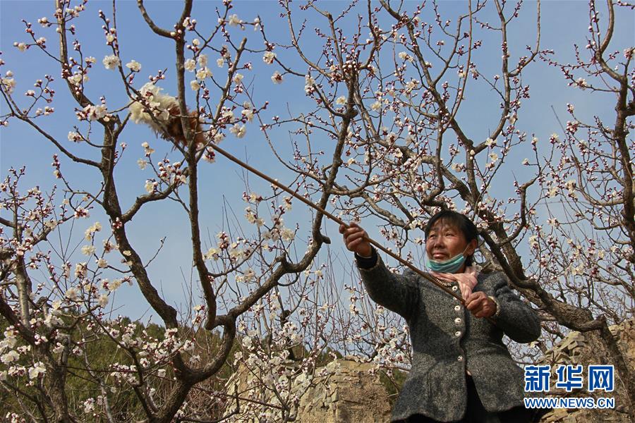 3月27日,河北唐山遵化市娘娘庄乡大官屯村村民在杏树果园进行杏花授粉。三月春暖,春花绽放,各地农民伴着花香忙碌在田间地头。 新华社发(刘满仓 摄)