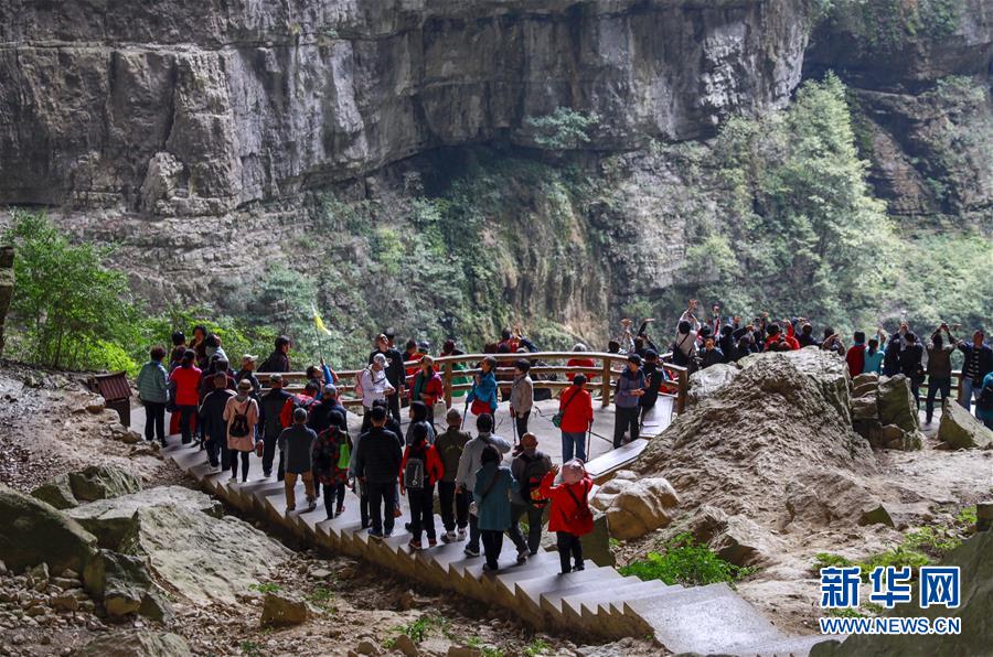 游客在天生三桥景区游览(3月27日摄)。 随着天气转暖,重庆武隆天生三桥景区风景如画,气势磅礴的天生石桥和绿意盎然的山林相映成趣,吸引众多游客前来踏春赏景。 新华社记者刘潺摄