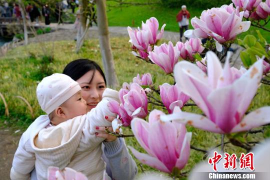 图为盛开的玉兰花吸引了小朋友的眼光。 张洋 摄