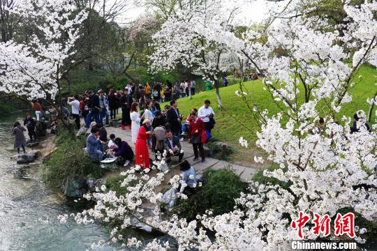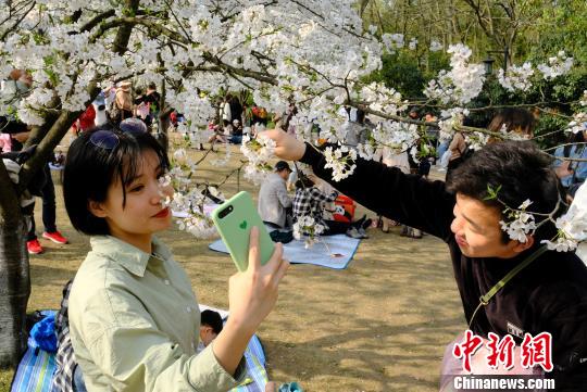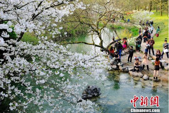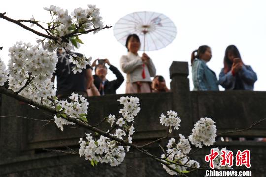 图为绽放的樱花吸引了民众观赏。 张洋 摄