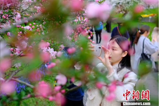 图为绽放的各色花吸引了游客驻足拍照。 张洋 摄