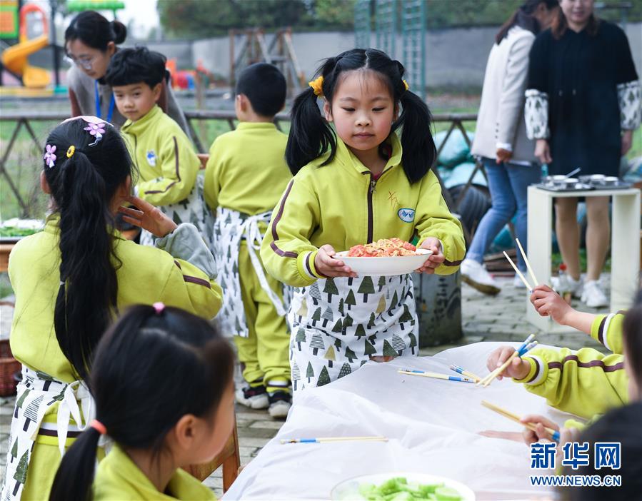 3月28日,孩子们把炒好的菜端上“田园餐桌”。 当日,在浙江省长兴县和平镇吴山中心幼儿园的小农庄中,孩子和老师们一起开展春季“田园餐桌”活动。孩子们在农庄里采摘芹菜、大蒜、青菜等十余种蔬菜,然后洗菜、切菜,并在农庄里的小土灶上炒菜,体验劳动的快乐和收获的乐趣。 新华社记者 徐昱 摄