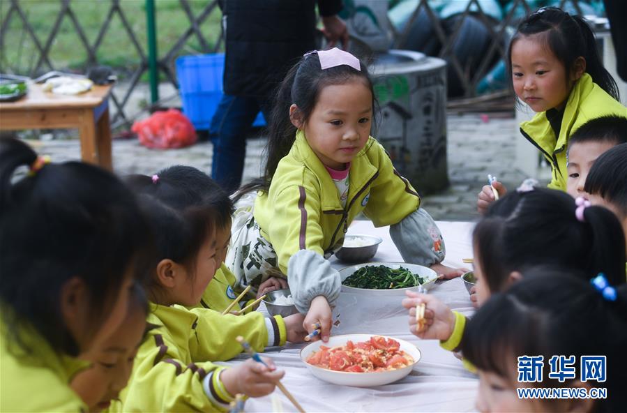 3月28日,孩子们把炒好的菜端上“田园餐桌”。 当日,在浙江省长兴县和平镇吴山中心幼儿园的小农庄中,孩子和老师们一起开展春季“田园餐桌”活动。孩子们在农庄里采摘芹菜、大蒜、青菜等十余种蔬菜,然后洗菜、切菜,并在农庄里的小土灶上炒菜,体验劳动的快乐和收获的乐趣。 新华社记者 徐昱 摄