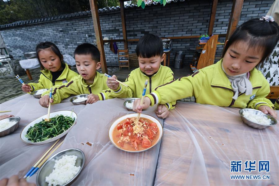 3月28日,孩子们在品尝“田园餐桌”上的劳动成果。 当日,在浙江省长兴县和平镇吴山中心幼儿园的小农庄中,孩子和老师们一起开展春季“田园餐桌”活动。孩子们在农庄里采摘芹菜、大蒜、青菜等十余种蔬菜,然后洗菜、切菜,并在农庄里的小土灶上炒菜,体验劳动的快乐和收获的乐趣。 新华社记者 徐昱 摄