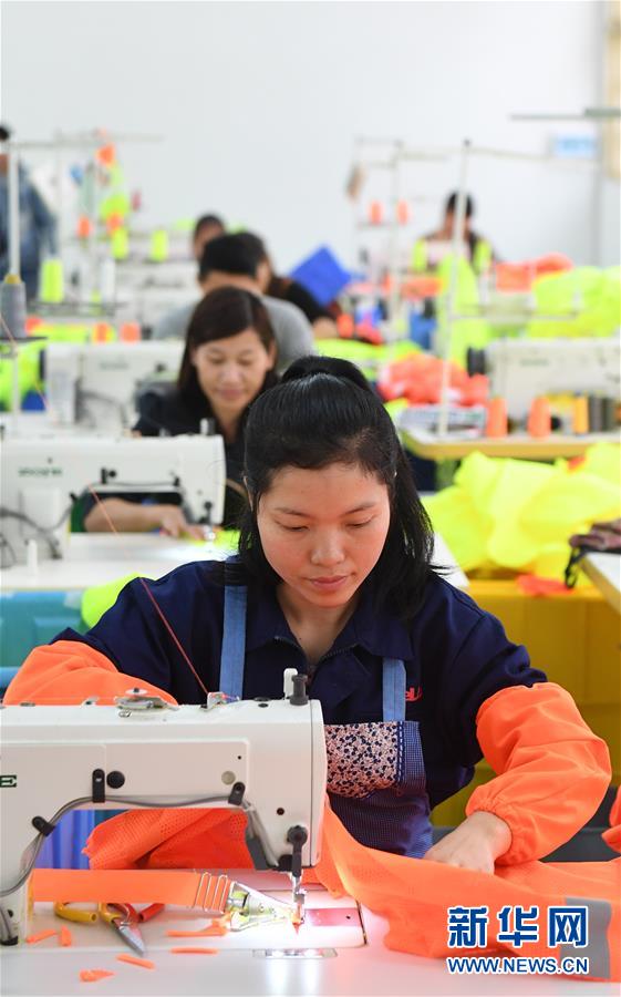 3月28日,工人在凌云县泗城镇镇洪村一家服饰加工企业的“扶贫车间”内缝制服饰。 广西凌云县在各乡镇建有11家“扶贫车间”,帮助当地农村剩余劳动力和贫困群众在家门口就业,增加收入脱贫致富。 新华社记者陆波岸摄