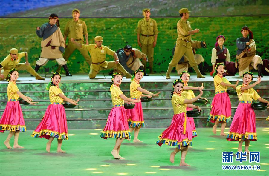 3月28日,演员在表演情景歌舞《军民鱼水情》。 当日,纪念西藏民主改革60周年主题晚会——《共产党来了苦变甜》在拉萨市群众文化体育中心举行。 新华社记者 李鑫 摄