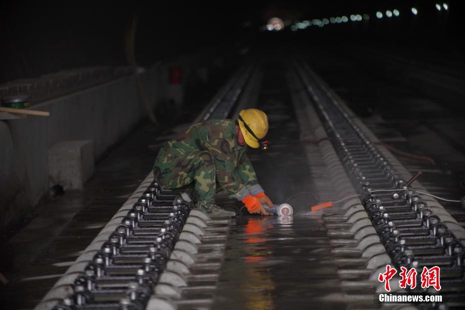 图为工人在修整轨道板施工缝。中新社记者 贾天勇 摄