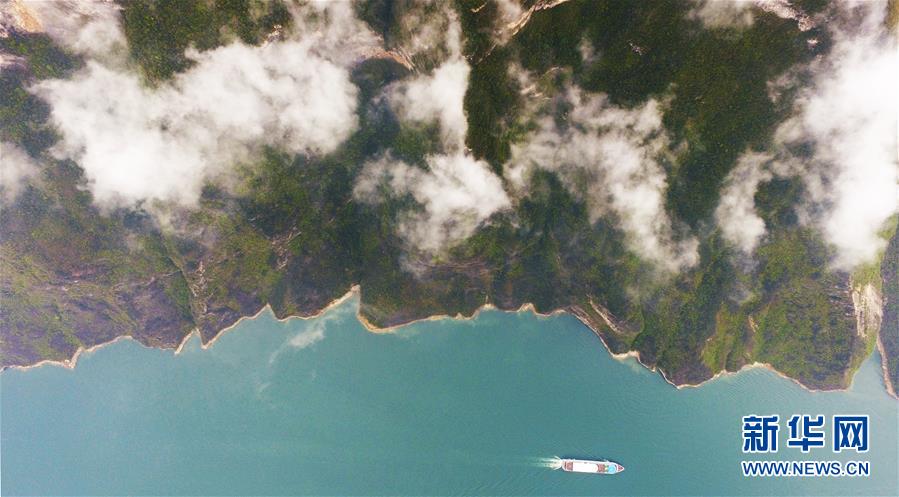 3月28日,船只在长江瞿塘峡段江面上航行(无人机拍摄)。当日,长江瞿塘峡一带云雾缭绕,景色秀美。瞿塘峡西起重庆市奉节县白帝城,东至巫山县大溪镇,全长约8公里,以“雄奇”“险峻”著称。 新华社记者 王全超 摄