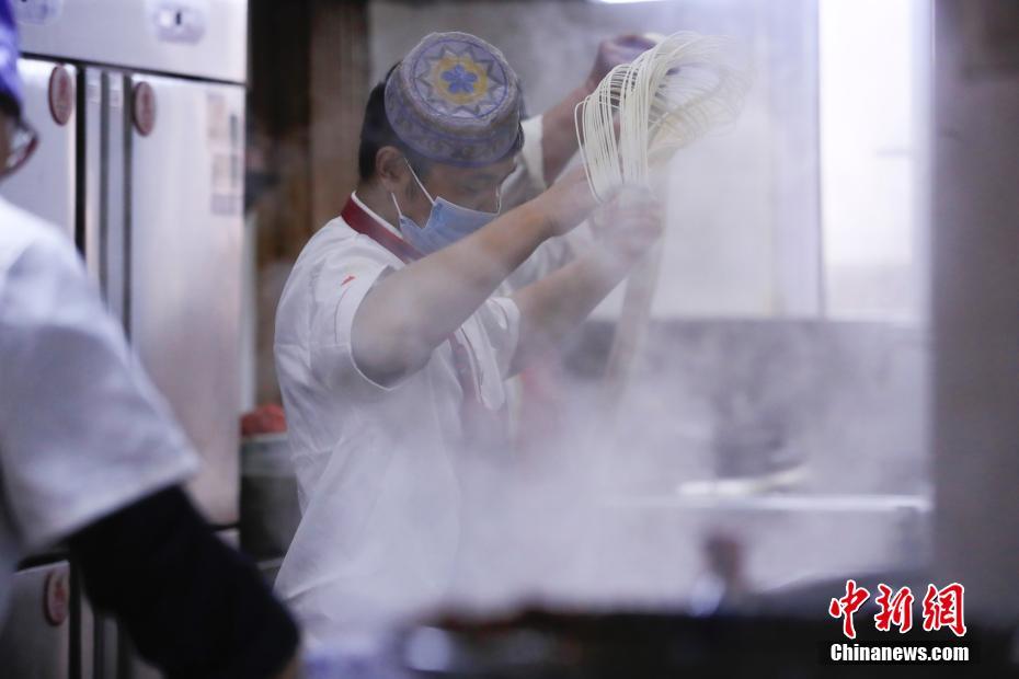 宁夏吴忠杨德福早茶拉面店的厨师正在制作牛肉面。中新社记者 杜洋 摄