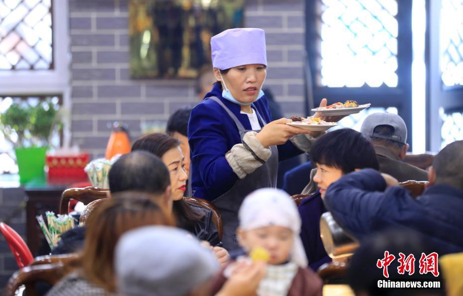宁夏吴忠杨德福早茶拉面店的服务员为顾客端菜。中新社记者 杜洋 摄