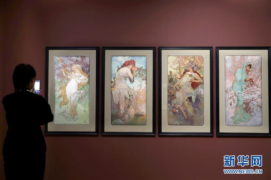 展览上展出的穆夏的海报艺术代表作“四季”系列(3月29日摄)。 当日,中捷建交70周年重点文化交流活动之一——穆夏展在上海明珠美术馆举行开幕式及媒体预览。 新华社记者刘颖摄