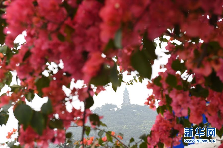 南宁市青山塔掩映在盛开的三角梅之中(3月30日摄)。新华社记者 陆波岸 摄
