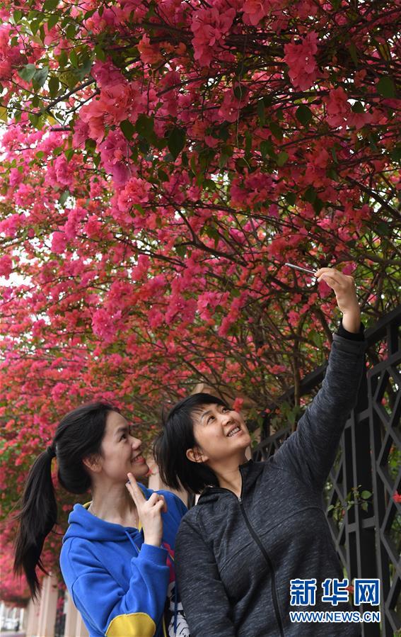 新华社照片,南宁,2019年3月30日 广西南宁:花艳满城春更浓 3月30日,在南宁市青环路,市民在盛开的三角梅下拍照。 仲春时节,广西南宁市的三角梅花开正艳,成为这个南国都市一道绚丽的风景。 新华社记者 陆波岸 摄