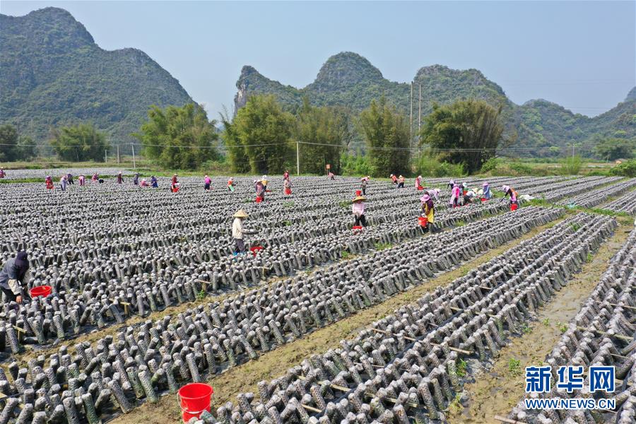 3月30日,农民在广西贺州市钟山县回龙镇一处食用菌基地采收黑木耳。新华社发(官业勋 摄)