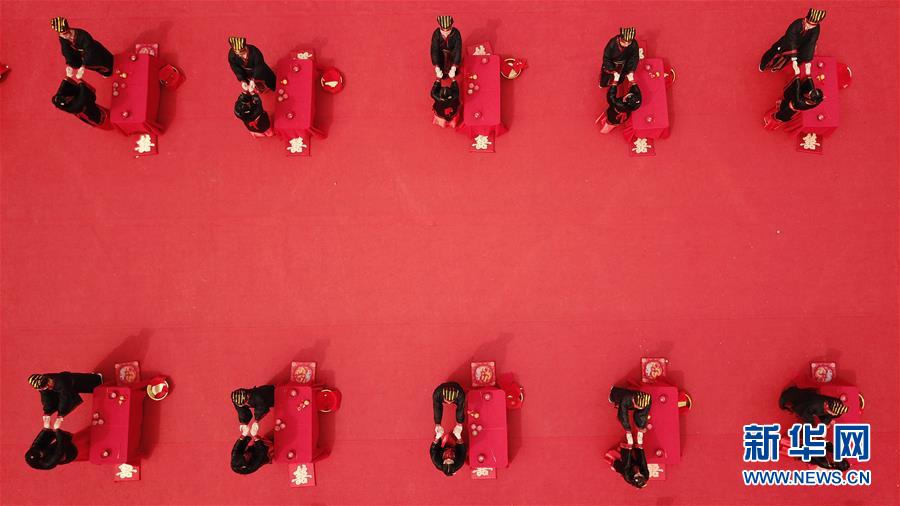 3月30日,新人们在参加汉式集体婚礼(无人机拍摄)。新华社记者 张端 摄