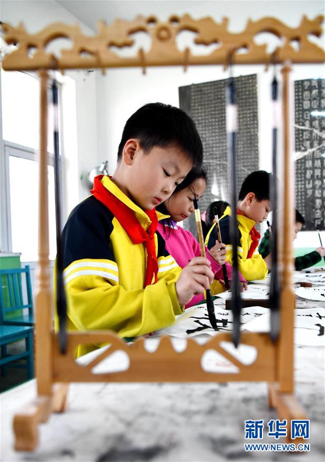 3月30日,在河北省廊坊市第十四小学,学生在练习书法。新华社记者王晓摄