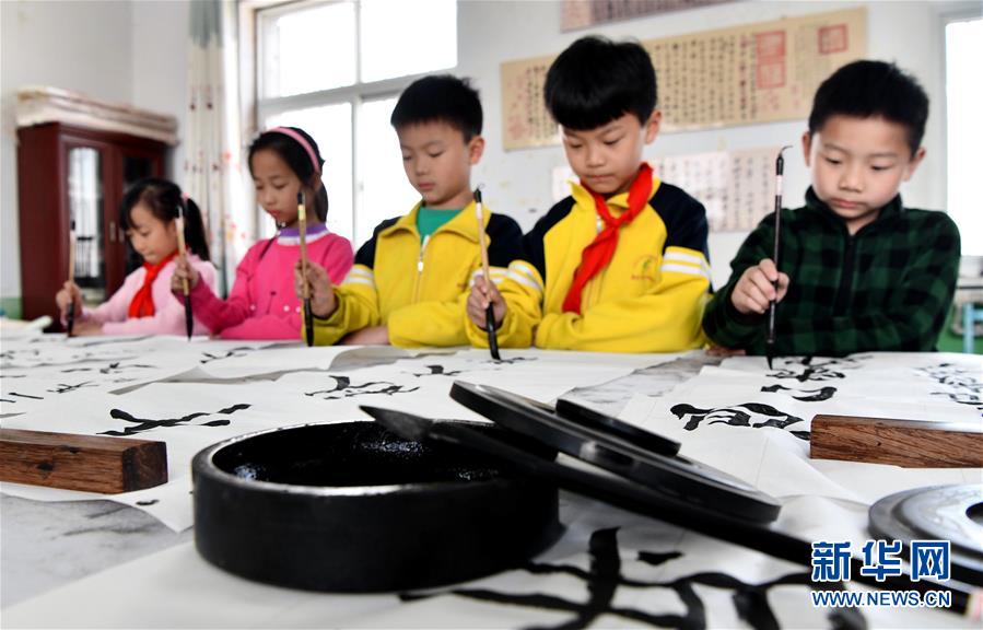 3月30日,在河北省廊坊市第十四小学,学生在练习书法。新华社记者王晓摄